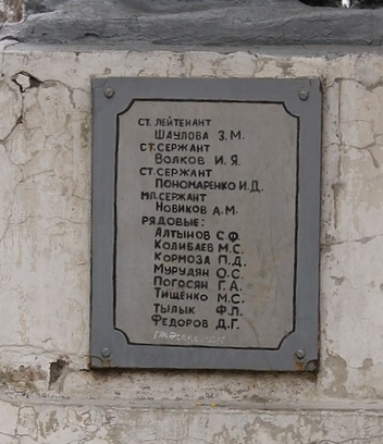 ст. лейтенант Шаулова Зинаида Алексеевна, 1921 г., Калининская обл., Кушовский район, с. Бедное. Секретарь прокурора 13 Гв. стрелкового корпуса 2 Гв. армии. Умерла от ранения 9.09.1943 г. Похоронена Сталинская обл., Макеевский район, пос. Щальховский (ЦАМО ф. 33 оп. 11458 д. 130). На плите указана как Шаулова З.М.