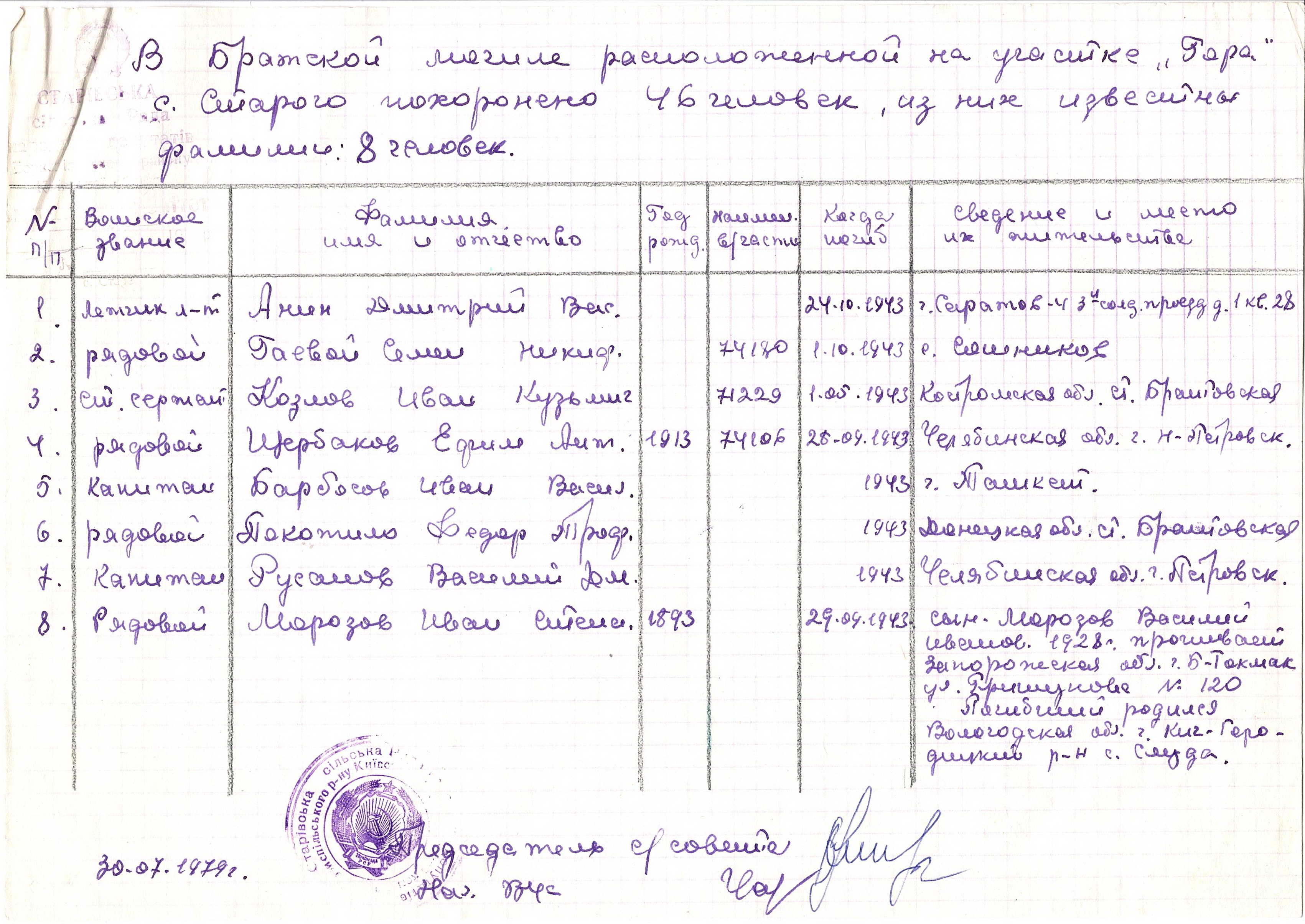 Списки погибших и захороненных в братских могилах на участке "Гора"