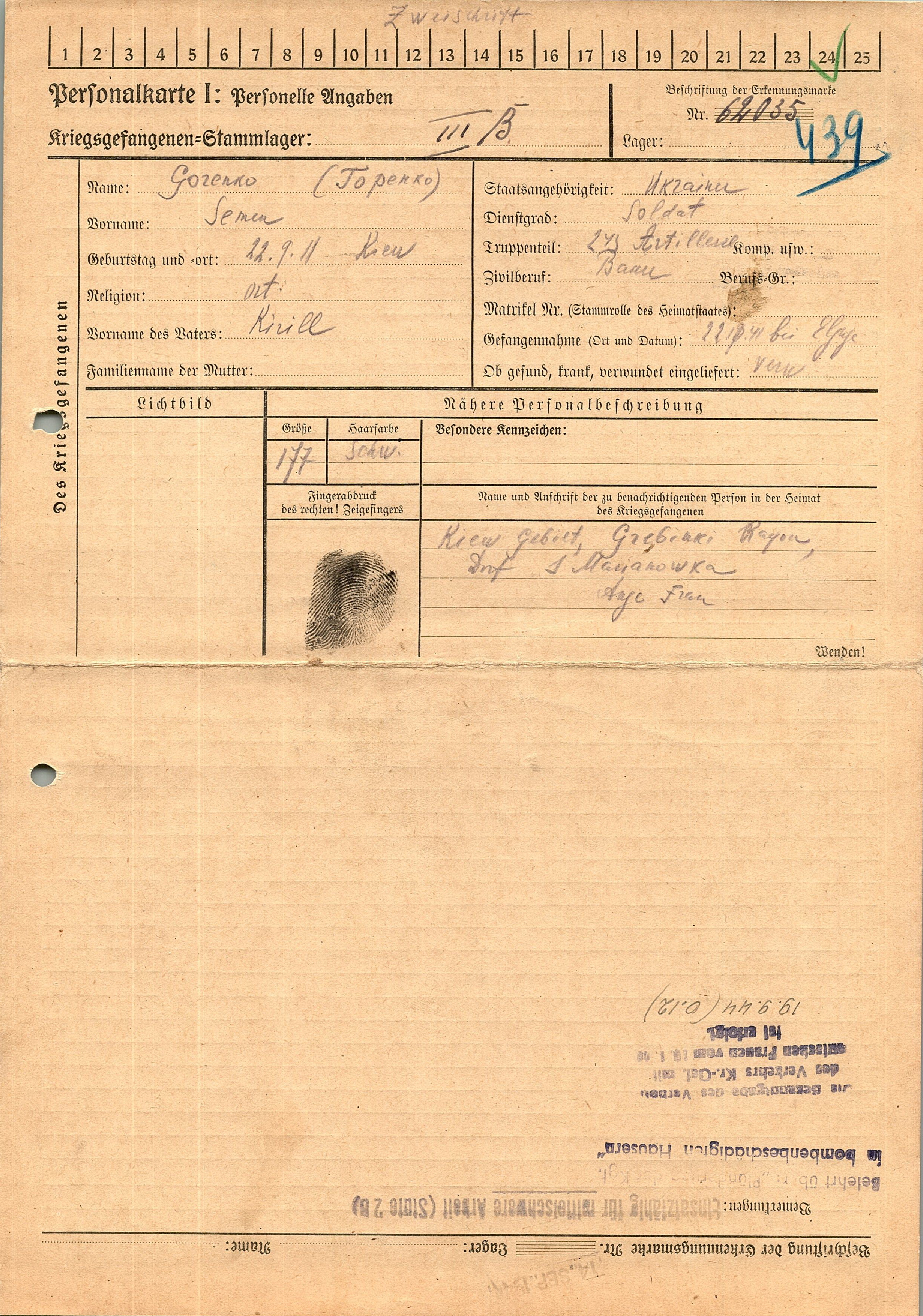 Военнопленные, трофейные карточки. Киевская обл.