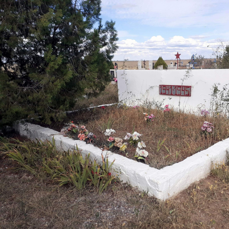 Слева от памятника, на могиле установлена прямоугольная стена из оштукатуренного камня-ракушечника. На стене закрепленная табличка с цифрами: «1941-1945».