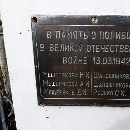 Могила жертв фашизма находится в северо-западной части сельского кладбища. Здесь похоронены останки 6 мирных жителей села Комзетовка (ныне с. Вересаево), расстрелянных фашистами 13 марта 1942 г. Среди погибших - трое взрослых и трое детей. В 1975 г. на могиле установлен обелиск. На второй ступени обелиска расположена табличка из металла с текстом: «В память о погибших в Великой Отечественной войне 13.03.1942 г. Мещерякова Р. И, Мещерякова А. И., Мещеряков Д. И., Шапошникова О. И., Шапошникова, Редько С. И.». Могила и памятник огорожены металлической изгородью.