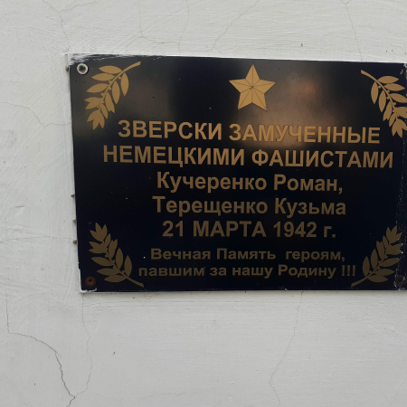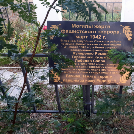 В 2,0 км к югу от села Червоное, захоронены останки Кучеренко Р. Г., Терещенко K. M., Лебедева С. П., которых расстреляли фашисты в 1942 году. В период временной оккупации Крыма немецко-фашистскими захватчиками в этом районе фашисты расстреляли более 850 человек – партийных, комсомольских работников и мирных жителей. В 1954 году, на могилах были установлены памятники, в 1985 году памятники заменены. На братской могиле установлен памятник в виде вертикальной стелы, установленной на постаменте. На лицевой стороне установлена мемориальная доска с текстом: «Зверски замученные немецкими фашистами Кучеренко Роман, Терещенко Кузьма, 21.03.1942». Рядом с братской могилой находится могила Лебедева С. П.; на могиле установлен памятник в виде вертикальной стелы, установленной на постаменте. На лицевой стороне расположена мемориальная доска с текстом: «В память о друге и муже Лебедеве Савве Петровиче зверски расстрелянном немецкими захватчиками 21 марта 1942 года, родился 29 марта 1900 года. Память от жены, детей, внуков». Захоронения ограждены оградой. На месте массовой гибели советских граждан в 1992 году установлен памятник в виде каменный глыбы на постаменте. На лицевой стороне памятника установлена мемориальная доска с текстом: «Остановись, путник. На этом поле в 1942-1943 годах фашисты расстреляли более 850 жителей Сакского района. Склони голову в память о них!».