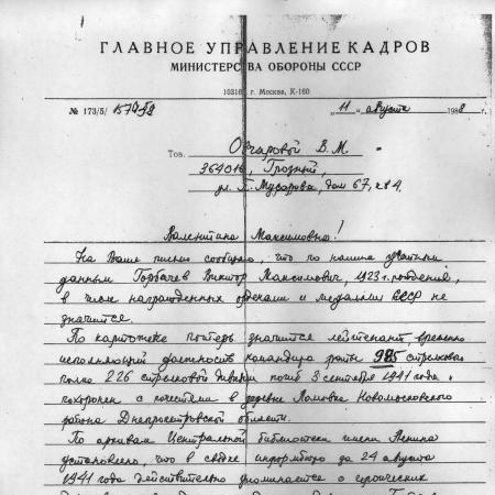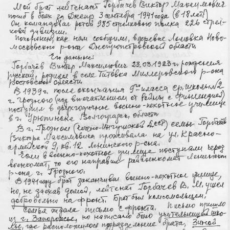 Горбачев Виктор Максимович, 23.03.1923 г.р., с. Титовка Миллеровского района Ростовской области. Лейтенант. Вр.и.о. командира роты 985 стрелкового полка 226 стрелковой дивизии. Убит 03.09.1941 г. Похоронен с. Ломовка - территория Ломовского плацдарма на левом берегу р. Днепр (ЦАМО ф. 33 оп. 11458 д. 21). В настоящее время территория г. Днепропетровск.