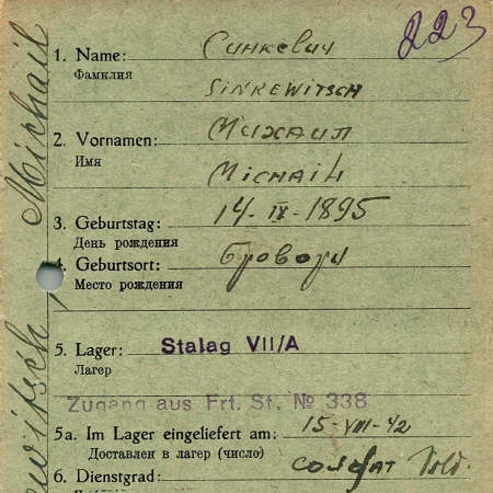 Зинкевич Михаил Семёнович, 14.09.1865 г. р, г. Бровары. Рядовой, 55 стрелковый полк. Попал в плен 22.07.1942 в Должанке, шталаг VII В.