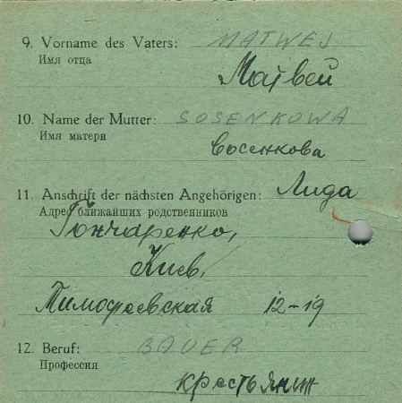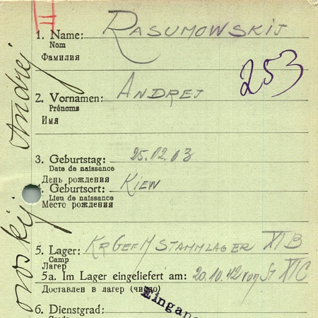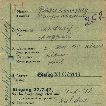 Разумовский Андрей Матвеевич, 28.12.1903 г. р, г. Киев. Рядовой, 44 пехотный полк. Попал в плен 11.08.1941 в Мироновске, шталаг ХІ.
