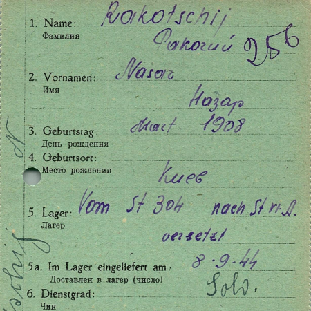 Ракочий Назар Карпович, март 1908 г. р, г. Киев. Рядовой пехотного полка. Попал в плен 10.08.1941 в Мельчино, шталаг 304.