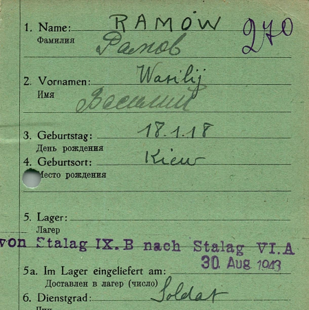 Рамов Василий Федорович, 18.01.1918 г. р. г. Киев. Рядовой, 75 пехотный полк. Попал в плен 07.08.1941 в с. Подвысокое, шталаг ІХ.