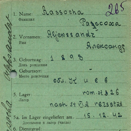 Рассоха Александр Иванович, 1898 г. р, Киевская обл. Рядовой, 300 пехотный полк. Попал в плен 10.07.1942 на Дону, шталаг VІ А.