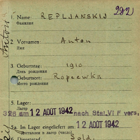 Реплянский Антон Иосифович, 1910 г. р, с. Ропеевка, Киевская обл. Рядовой, 1056 пехотный полк. Попал в плен 18.09.1941 в Харькове, шталаг VI F.