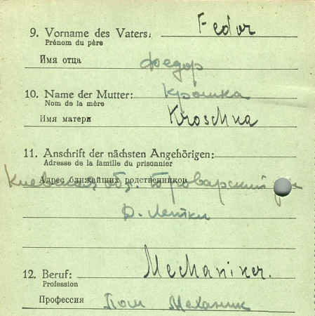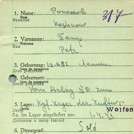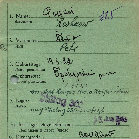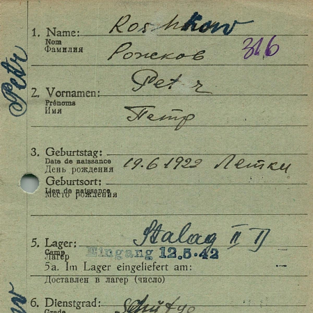 Рожков Петр Фёдорович, 19.06.1922 г. р., Броварсокй р-н, с.Лешки. Рядовой, 142 стрелковый полк. Попал в плен 22.07.1941 в Старой Руси, шталаг 303.
