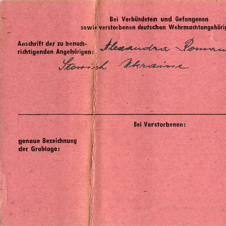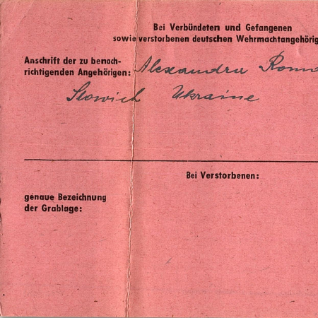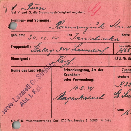 Романюк Андрей Александрович, 30.12.1914 г. р., с. Яняшивка. Рядовой, 153 авто-батальйон. Попал в плен 26.09.1941 в Яготине, шталаг VІІІ С.