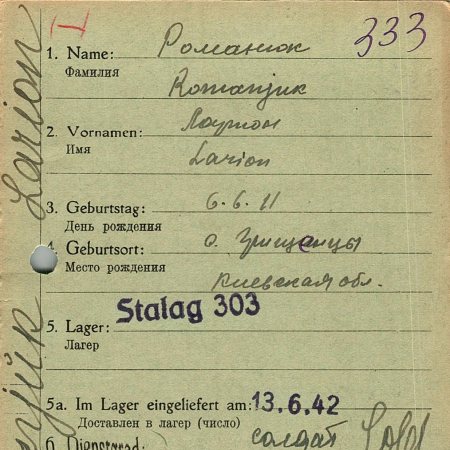 Романюк Ларион Михайлович, 06.07.1911 г. р., г. Грещенцы. Рядовой пехотного полка. Попал в плен 06.08.1941 в с. Кисники, шталаг ІІ В.