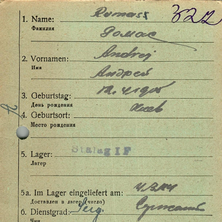 Ромас Андрей Степанович, 12.04.1905 г. р., г. Киев. Рядовой, 1086 стрелковый полк. Попал в плен 21.09.1941 в Лубнах, шталаг І Ф.