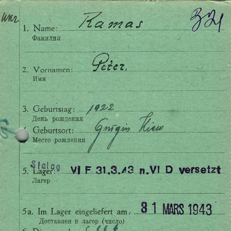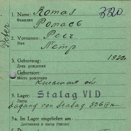 Ромас Петр Денисович, 1922 г. р., г. Киев. Рядовой, 311 батальйон. Попал в плен 22.09.1941 в Ростове, шталаг VІ D.