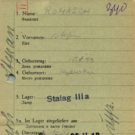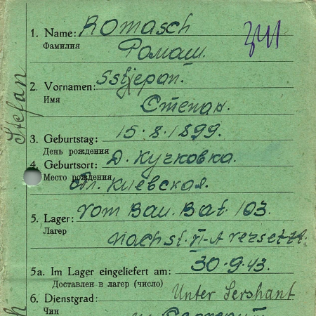 Ромаш Степан Иванович, 15.08.1899 г. р., Киевская обл., д. Кучковка. Младший сержант, 884 пехотный полк. Попал в плен 12.0.1942 в Донце, шталаг ІІІ А.