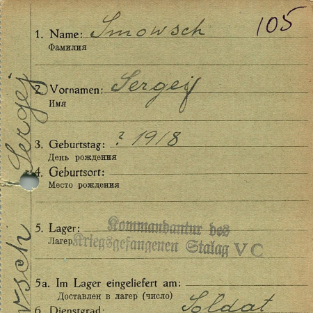 Смовш Сергей Евстратович, 1918 г. р, д. Шерева. Рядовой артиллерийского полка. Попал в плен 23.06.1941 в Белостоке, шталаг V В.