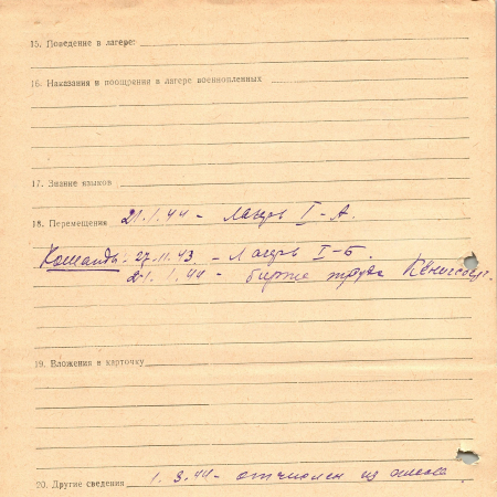 Михальский Григорий Васильевич, 1910 г. р., дер. Затринка. Гражданский. Попал в плен 23.10.1943 г. в деревне красный хутор, шталаг I Б. 21.01.1944 был перевелен в лагерь І А.