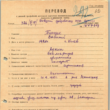 Тындак Василий Архипович, 1920 г. р., г. Киев. Рядовой артиллерийского полка. Попал в плен 10.09.1941 г. в районе Ленинграда в лагерь 326 (VI F). 20.06.1944 переведен в Бухенвальд.