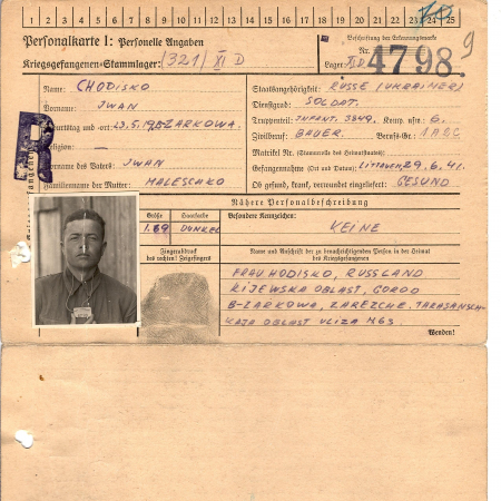 Ходиско Иван Иванович, 23.05.1919 г. р., г. Белая Церковь. Рядовой, 3849 стрелковая часть. Попал в плен 29.06.1941 года в Литве, шталаг 321 (ХІ D), 01.12.1941 переведен шталаг XI Б.