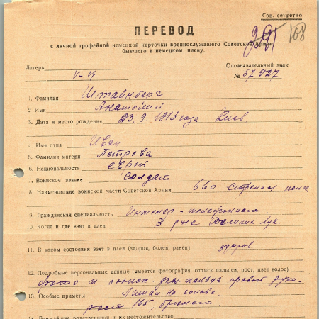 Штайнберг Анатолий Иванович, 23.09.1913 г. р., г. Киев. Рядовой, 660 стрелковый полк. Попал в плен в районе Великих Лук в шталаг V Ц. 21.09.1942 г. попал в лагерь Мальшбах, 03.12.1942 передан в Гестапо.
