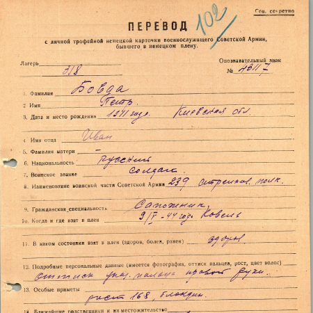 Бовда Петр Иванович, 1911 г. р., Киевская область. Рядовой, 239 стрелковый полк. Попал в плен 09.05.1944 г. в Ковеле, шталаг 318. 09.03.1945 был переведен в лагерь VI K.