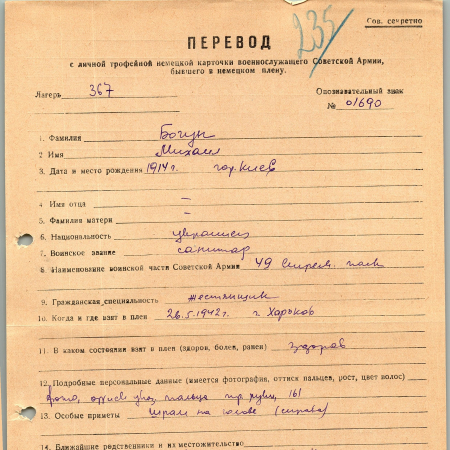 Богун Михаил, 1914 г. р., г. Киев. Санитар, 49 стрелковый полк. Попал в плен 26.05.1942 в Харькове, шталаг 367. 28.06.1942 был переведен в лагерь VI К.