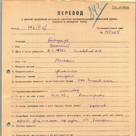 Бондарь Василий Михайлович, 02.01.1926 г. р., Киевская область. Рядовой, 1140 стрелковый полк. Попал в плен 17.10.1943 в Дмитриево, шталаг 326 (VI K). 15.01.1944 был переведен в лагерь XI Б, 20.12.1944 - в шталаг VI K.