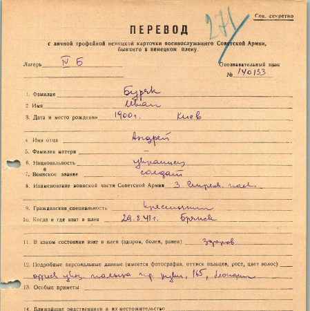 Буряк Иван Андреевич, 1900 г. р., г. Киев. Рядовой, 3 стрелковый полк. Попал в плен 29.08.1941 в Брянске, шталаг IV Б. 17.02.1945 был переведен в лагерь VI K.