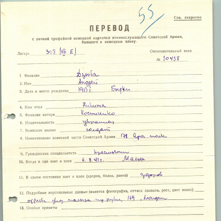 Дзюба Андрей Никитич, 1913 г. р., с. Бырки. Рядовой, 178 артиллерийский полк. Попал в плен 06.08.1941 г. в Малине, шталаг 308 (VIII E).