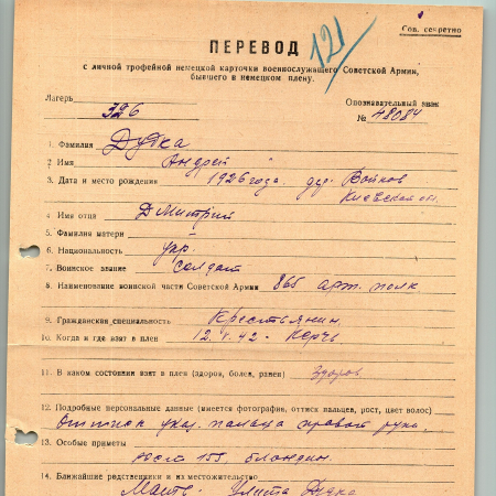 Дудка Андрей Дмитриевич, 1926 г. р., д. Войков, Киевская область. Рядовой, 865 артиллерийский полк. Попал в плен 12.05.1942 в Керчи, шталаг 326.