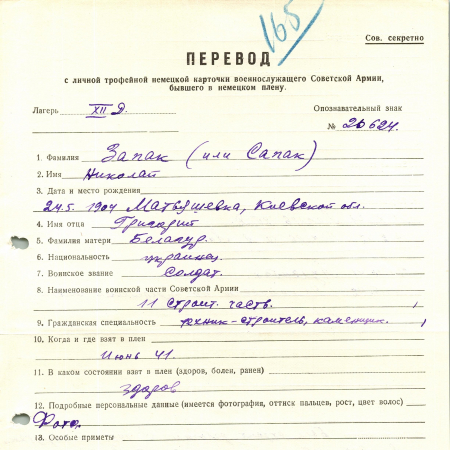 Запак (Сапак) Николай Григорьевич, 24.05.1904 г. р., д. Матьяшевка, Киевская область. Рядовой, 11 строительная часть. Попал в плен в июне 1941 года, шталаг ХІІ Д. 19.02.1942 переведен в лагерь ХІІ А Лимбург.