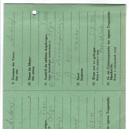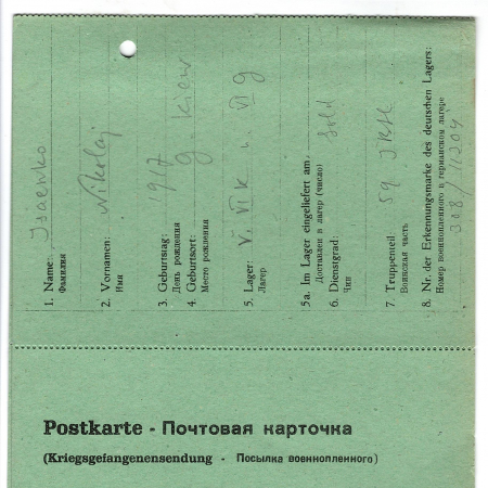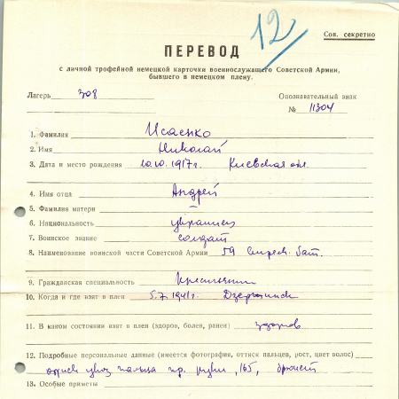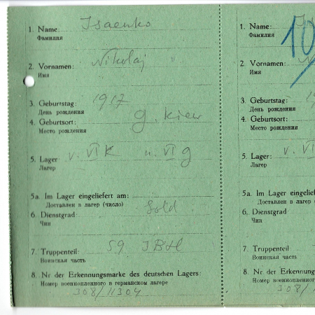 Исаенко Николай Андреевич, 10.10.1917 г. р., Киевская область. Рядовой, 59 стрелковый батальйон. Попал в плен 05.07.1941 в Дзержинске, шталаг 308. 17.02.1945 г. был перемещен в лагерь VI K, 02.03.1945 - в VI Г.