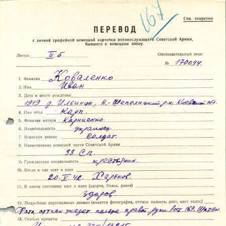 Коваленко Иван Карпович, 1919 г. р., д. Ильинцы, Ново-Шепелицкий район, Киевская область. Рядовой, 38 стрелковый полк. Попал в плен 20.05.1942 в Харькове, шталаг IV Б. 13.08.1942 переведен в Лагерь IV Ф.
