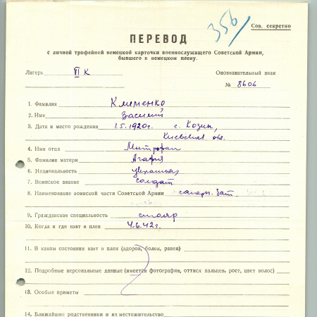 Клименко Василий Митрофанович, 01.05.1920 г. р., с. Козин, Киевская область. Рядовой саперного батальйона. Попал в плен 04.06.1942, шталаг VI K. 12.06.1943 был переведен в лагерь VI A, 20.11.1943 - в шталаг VI K.