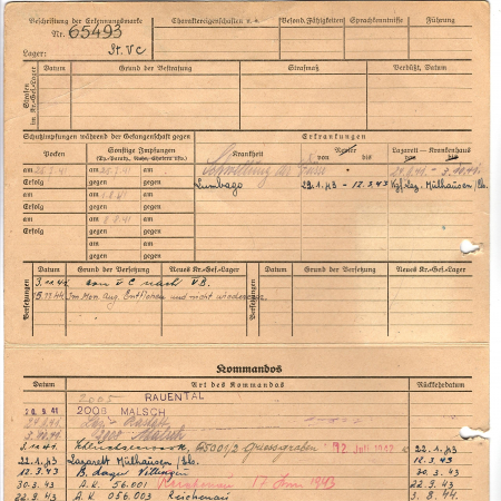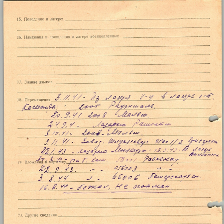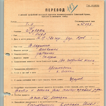 Корсак Илья Владимирович, 26.07.1920 г. р., д. Бзов. Рядовой, 130 стрелковый полк. Попал в плен в Слониме, шталаг X Ц. 03.11.1941 был перемещен в лагерь V Б.