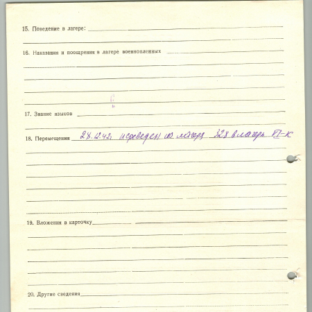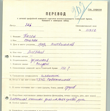 Косян Степан Михайлович, 1909 г. р, Киевская область. Рядовой, 738 воинская часть. Попал в плен 04.07.1942 в Севастополе, шталаг 326. 28.08.1942 переведен из лагеря 328 в лагерь VI K.