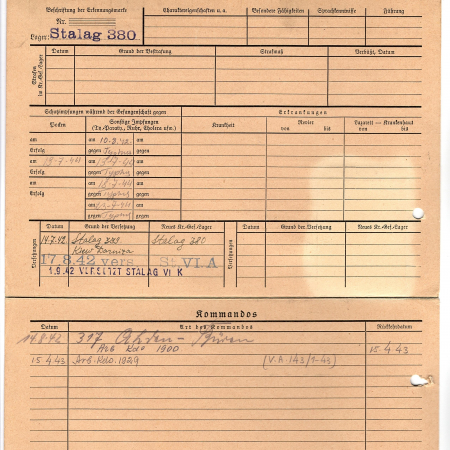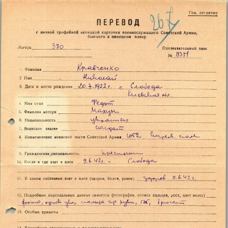Кравченко Николай Федотович, 20.07.1922 г. р., с. Слобода, Киевская область. Рядовой, 1052 стрелковый полк. Попал в плен 09.06.1942 в Слободе, шталаг 380. 17.08.1942 был переведен в лагерь VI A, 01.09.1942 - в шталаг VI K.