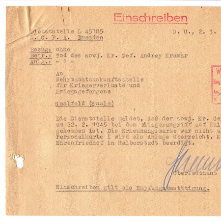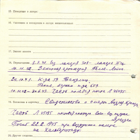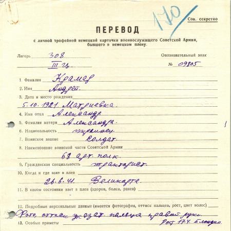 Крамар Андрей Александрович, 05.10.1921 г. р., с. Матриевка. Рядовой, 68 артиллерийский полк. Попал в плен 26.06.1941 в Великарте, шталаг 308 (III Ц).