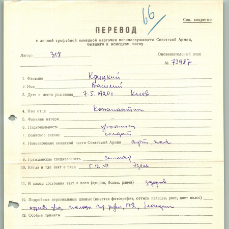 Крицкий Василий Константинович, 07.05.1920 г. р., г. Киев. Рядовой артиллерийского полка. Попал в плен 05.12.1941 г. в Эзеле, шталаг 318. 09.03.1945 был переведен в лагерь VI K.