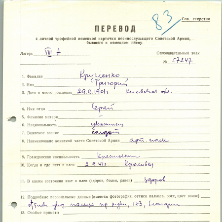 Кругленко Григорий Сергеевич, 29.09.1901 г. р., Киевская область. Рядовой артиллерийского полка. Попал в плен 02.09.1941 г. в Кроливце, шталаг VIII A. 09.03.1945 был переведен в лагерь VI K.