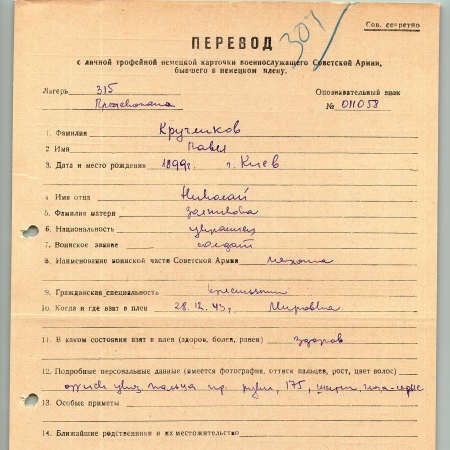Кругликов Павел Николаевич, 1899 г. р., г. Киев. Рядовой пехотного полка. Попал в плен 28.12.1943 в Мировке, шталаг 315. 27.05.1944 был переведен в лагерь VI K.