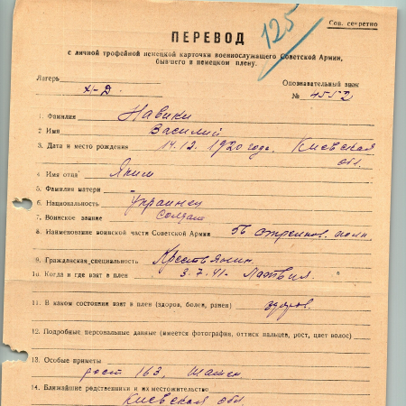 Навики Василий Якимович, 14.12.1920 г. р., Киевская область. Рядовой, 56 стрелковый полк. Попал в плен 03.07.1941 в Латвии, шталаг XI Д. 01.12.1941 был переведен в лагерь ХІ Б, 01.04.1943 - в Вольфен.
