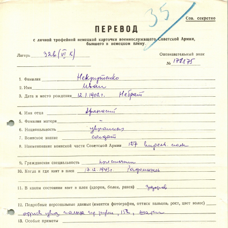 Некрутенко Иван Афанасьевич, 12.01.1902 г. р., с. Небрат. Рядовой, 127 стрелковый полк. Попал в плен 17.12.1943 в Радомышле, шталаг 326 (VI K). 08.09.1944 г. был переведен в лагерь ІІ К.