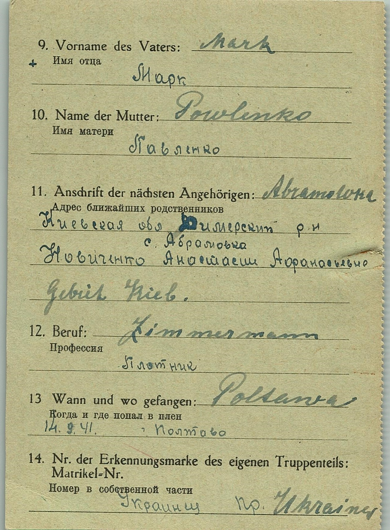 Военнопленные, трофейные карточки. Киевская обл.