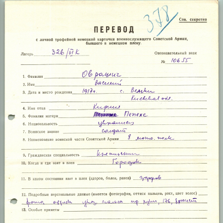 Оврашич Василий Кириллович, 1917 г. р., с. Вемки, Киевская область. Рядовой, 8 мотострелковый полк. Попал в плен в Городке, шталаг 326.