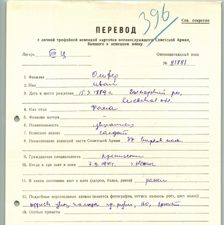 Олифер Иван Фомич, 15.03.1889 г. р., Дымерский район, Киевская область. Рядовой, 37 стрелковый полк. Попал в плен 07.09.1941 в Нежине, шталаг VIII Ц. 09.03.1945 был переведен в лагерь VI K.