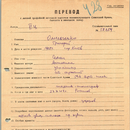Омельченко Григорий Семенович, 1908 г. р., г. Киев. Старший сержант, 526 артиллерийский полк. Попал в плен 27.07.1942 в Ростове, шталаг VI Ц. 15.05.1943 был переведен в лагерь Фюллен, 17.08.1943 - в Фейзен, 27.08.1943 - в шталаг VI K.