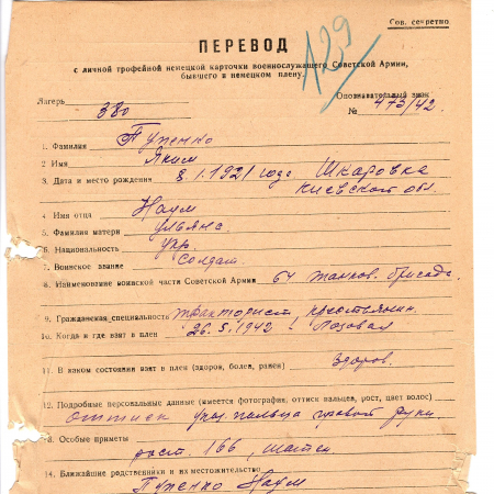 Пупенко Яким Наумович, 08.01.1921 г. р., с. Шкаровка, Киевская область. Рядовой, 64 танковая бригада. Попал в плен 26.05.1942 в д. Лозовая, шталаг 380.