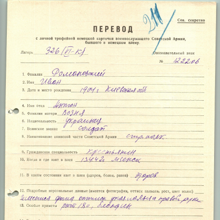 Романовский Иван Антонович, 1904 г. р, Киевская область. Рядовой стрелкового полка. Попал в плен 13.04.1942 в Мценске, шталаг 326 (VI K). 08.07.1943 переведен в Зандбостель, 06.08.1943 - в лагерь Х Ц.
