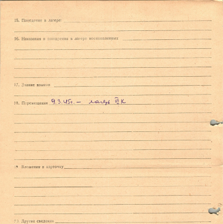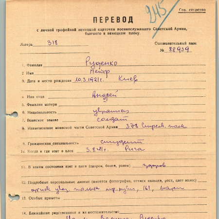 Руденко Петр Андреевич, 10.03.1921 г. р., г. Киев. Рядовой, 387 стрелковый полк. Попал в плен 03.08.1941 в Риге, шталаг 318. 09.03.1945 был переведен в лагерь VI K.